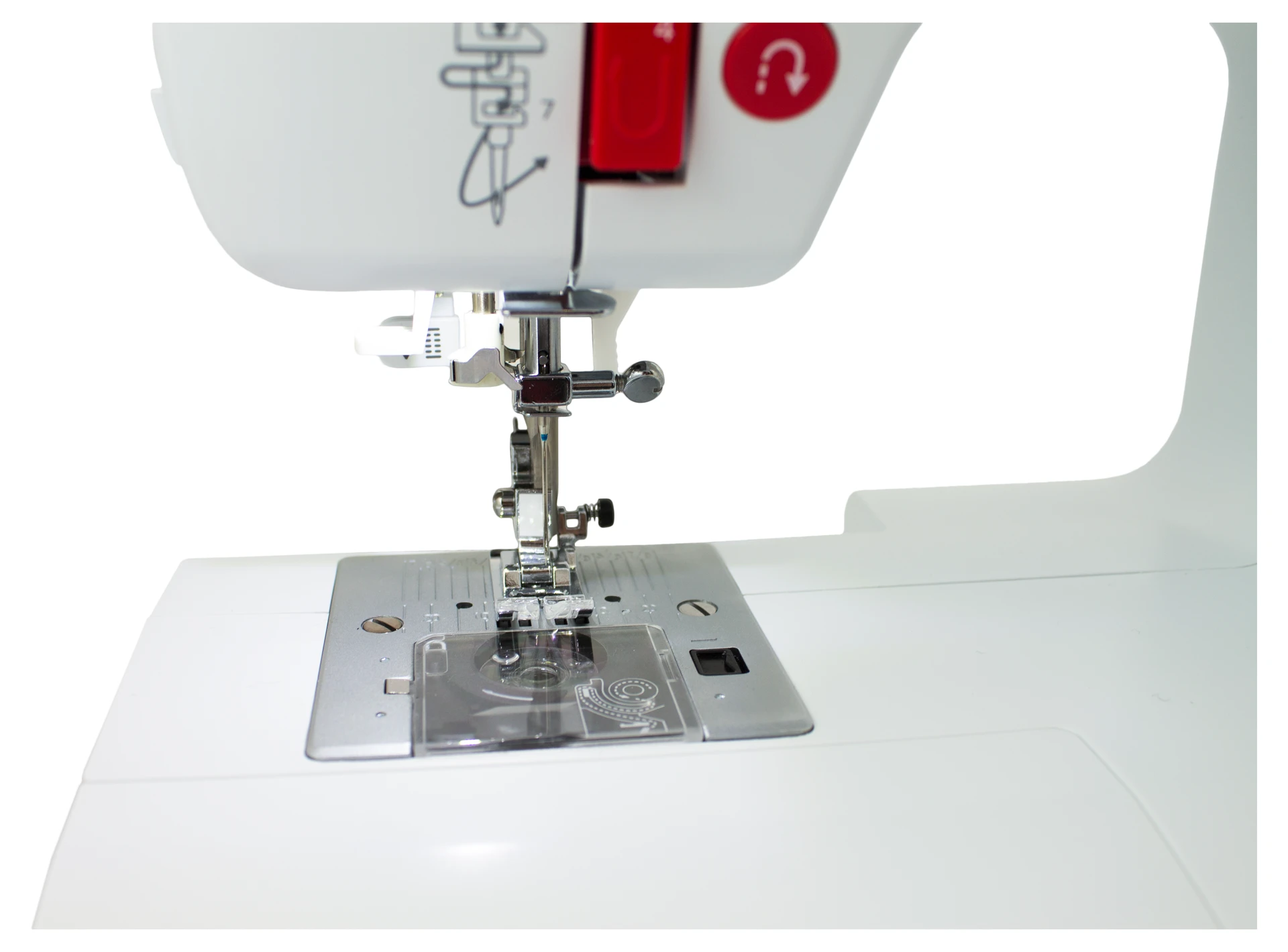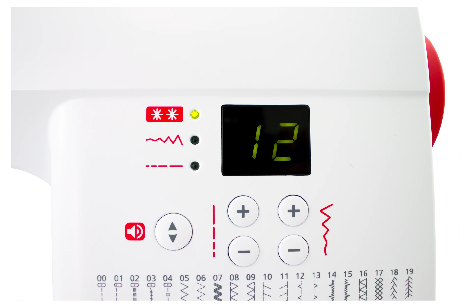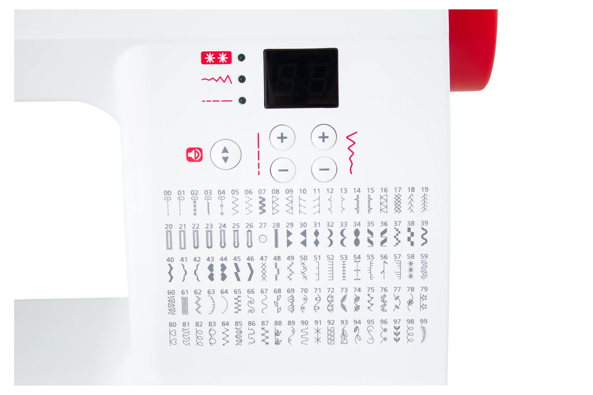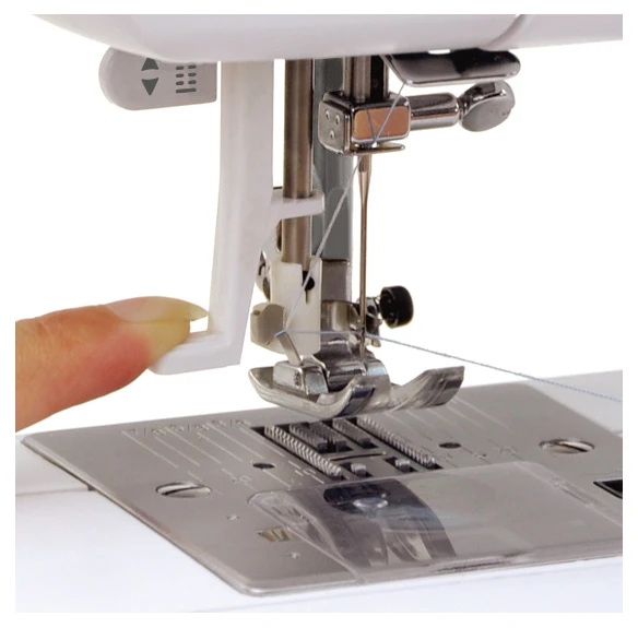 Každý šicí program má již přednastavenou optimální šířku a délku stehu. Začátečníkům i profesionálům významně usnadní práci navlékač nitě a jednokrokové šití knoflíkové dírky. Horizontální chapač umožňuje nastavení šířky stehu až na 7 mm a cívka s návinem spodní nitě se pohodlně vkládá shora.