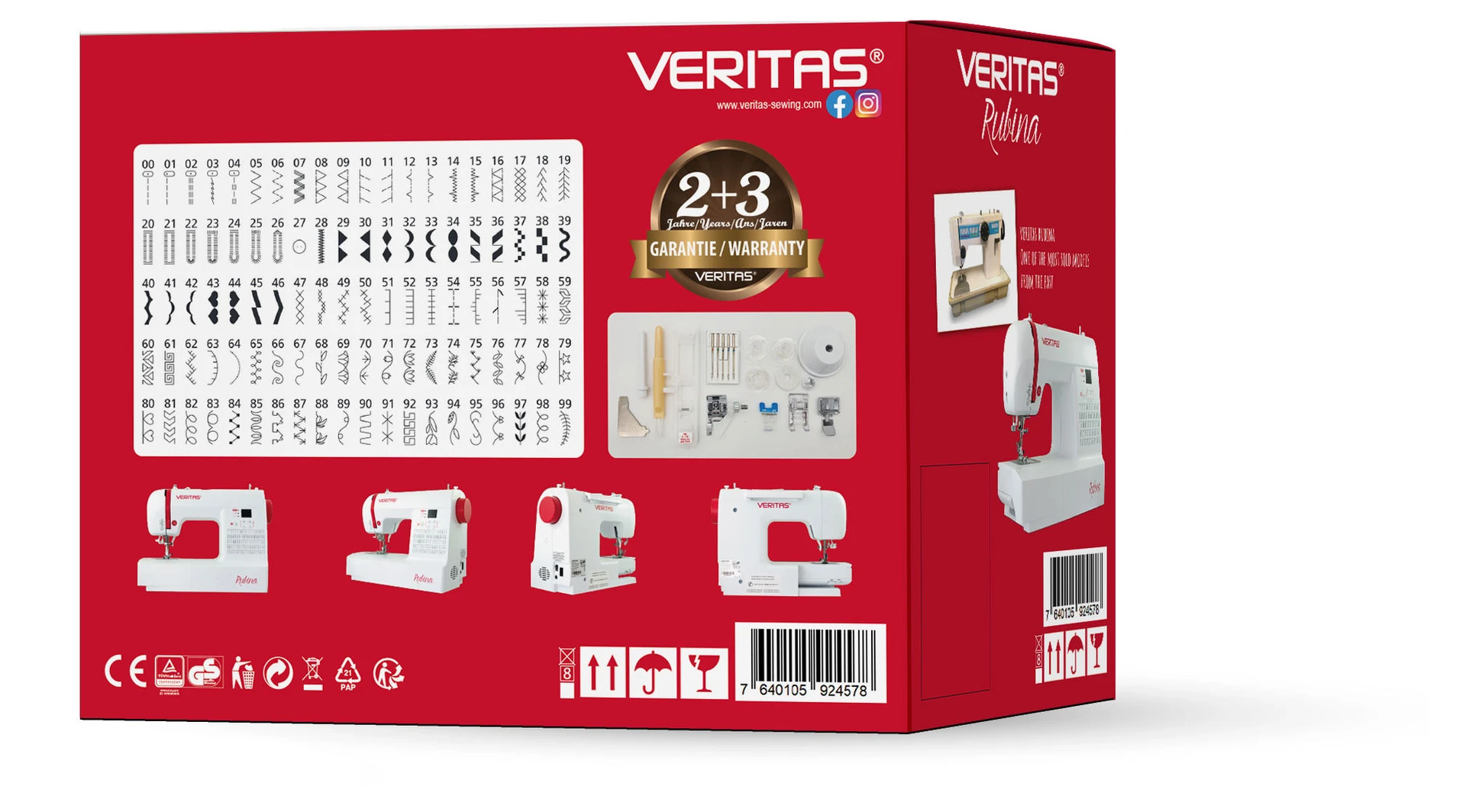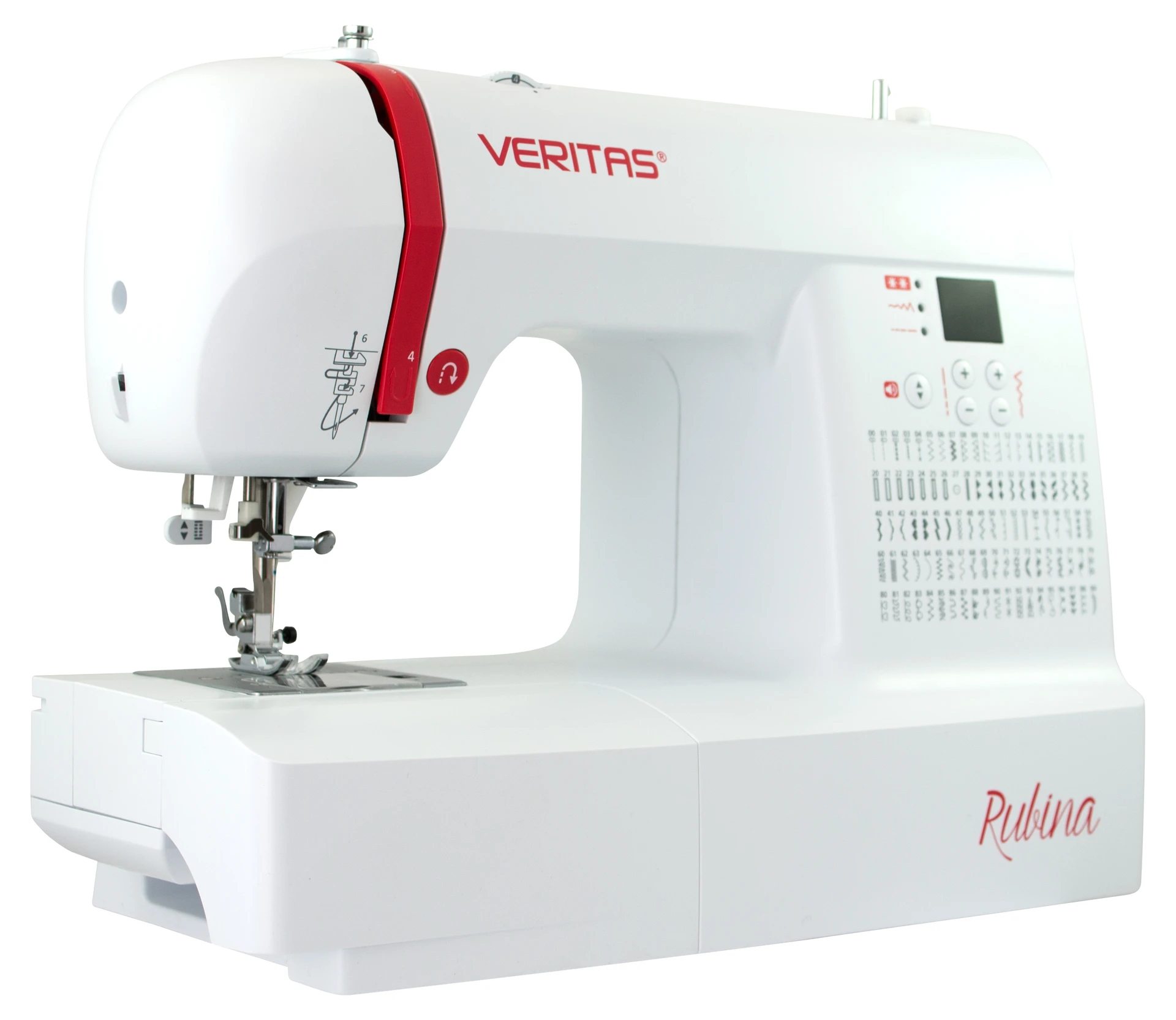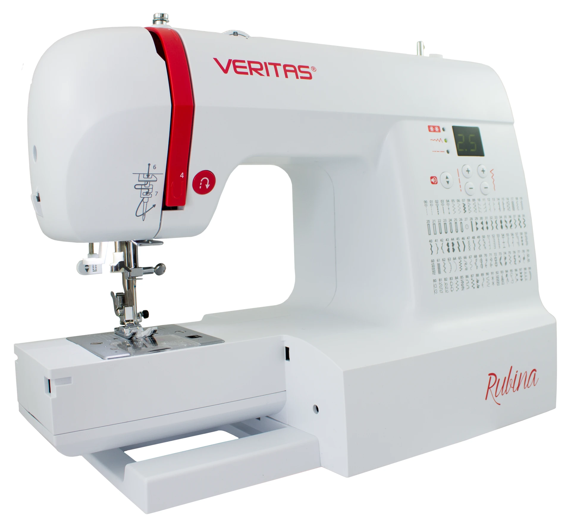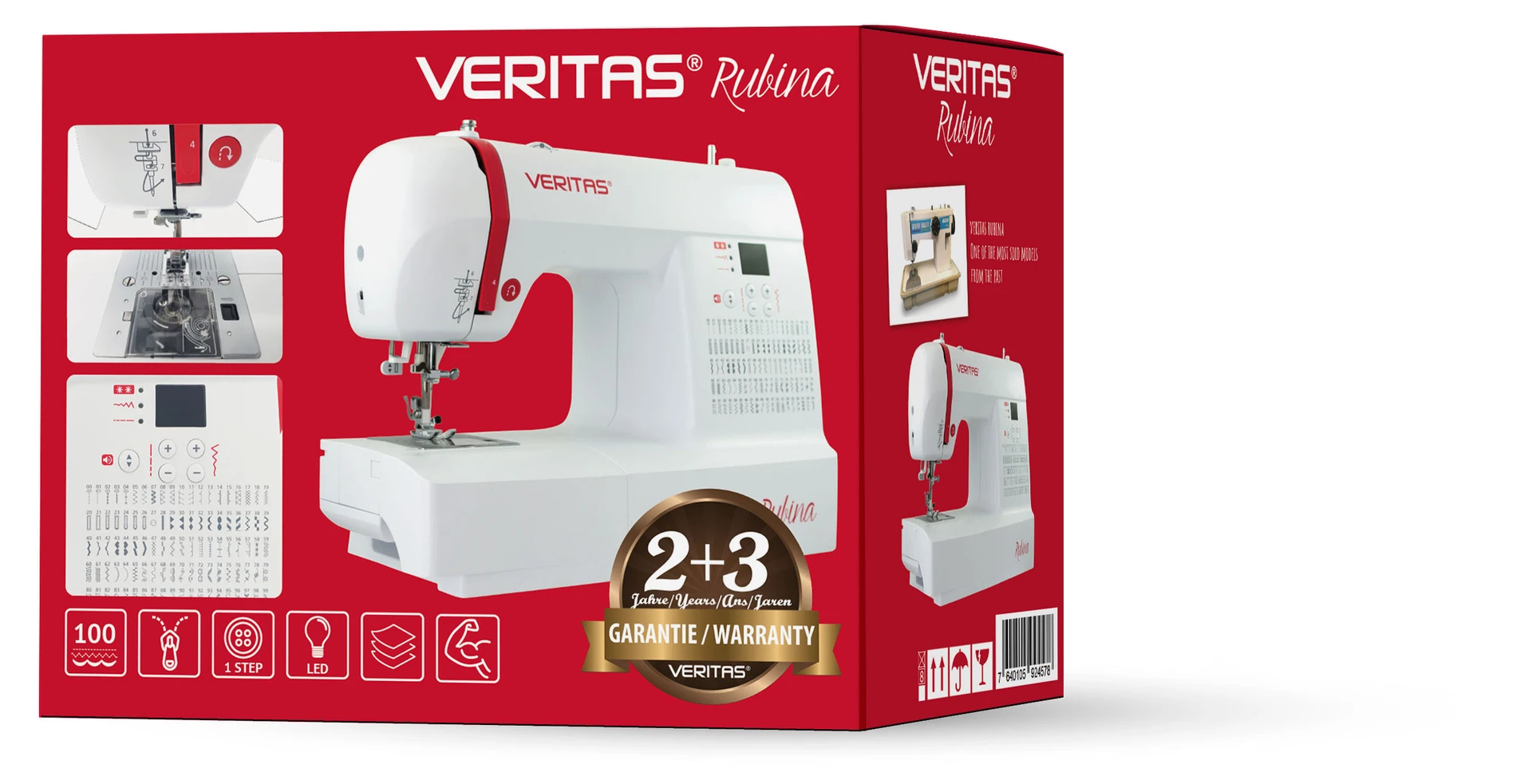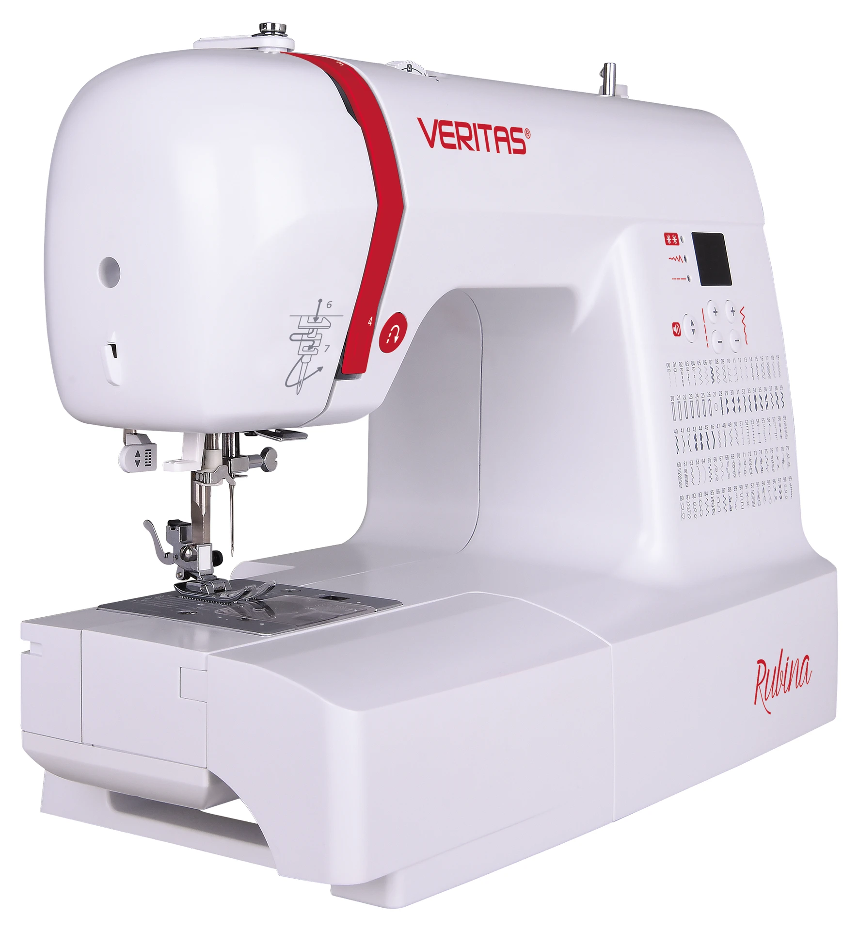 Vybavený 100 šicími programy, které zahrnují užitkové, pružné a overlockové stehy, 7 různých typů knoflíkových dírek a početné dekorativní stehy tak šicí stroj VERITAS Rubina nabízí vše, co potřebujete pro každodenní šití.